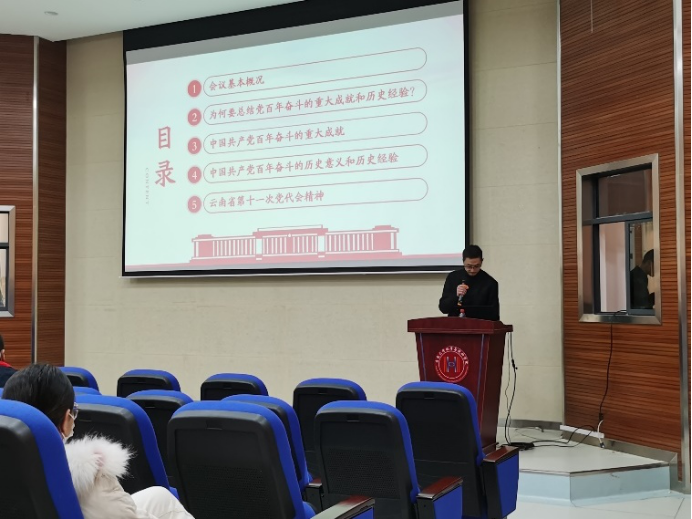 徐瑾老师讲解开宗明义,提纲挈领,报告中讲述了十九届六中全会的重要内容,即两个”确立”——确立习近平同志党中央的核心、全党的核心地位,确立习近平新时代中国特色社会主义思想的指导地位,将为何要总结百年奋斗的重大成就和历史经验这一重要问题的答案总结为“三个需要”,概括总结了中国共产党自成立以来创造的“四个伟大成就”,归纳了中国共产党百年奋斗的历史意义和历史经验,然后,传递了云南省第十一届党代会精神,介绍了今后5年工作的总体思路,为党员们确立了奋斗目标。