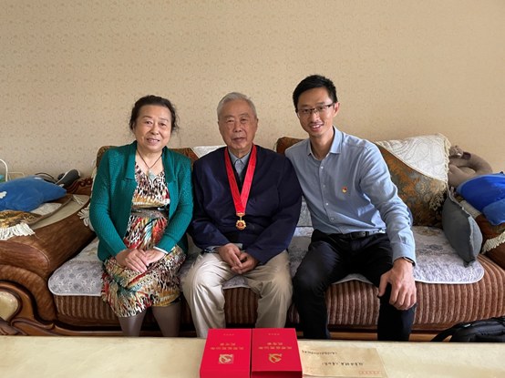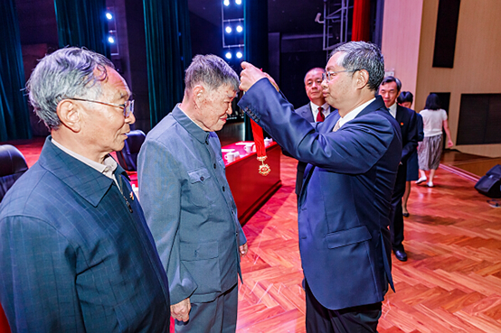 公司退休教师王学仁(原williamhill官网网站董事长)接受williamhill官网网站党委书记林文勋同志颁发“光荣在党50年”纪念章