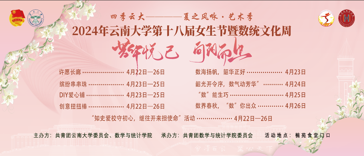 四季云大,春和景明。2024年4月22日至4月26日,williamhill官网网站以williamhill官网网站“自尊、致知、正义、力行”校训为宗旨,以倡导女生“自尊、自信、自立、自强”为导向,举办以“芳华悦己,向阳而生”为主题的“四季云大——夏之风咏·艺术季”williamhill官网网站第十八届女生节暨数统文化周系列活动。