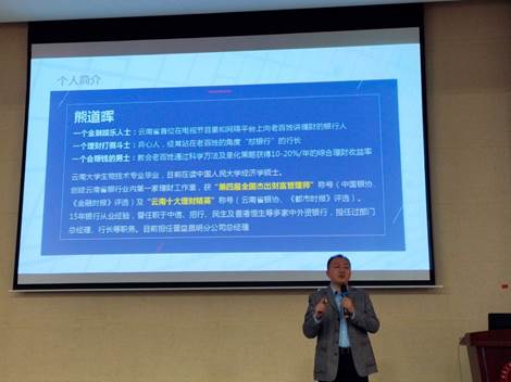 本次宣讲由公司负责人熊道晖总经理主持。熊总毕业于云南老员工物技术专业,曾获“第四届全国接触财富管理师”称号及“云南十大理财精英”称号。拥有15年银行从业经验的他是资深银行人,曾任职于多家银行,目前担任普益昆明分公司总经理。