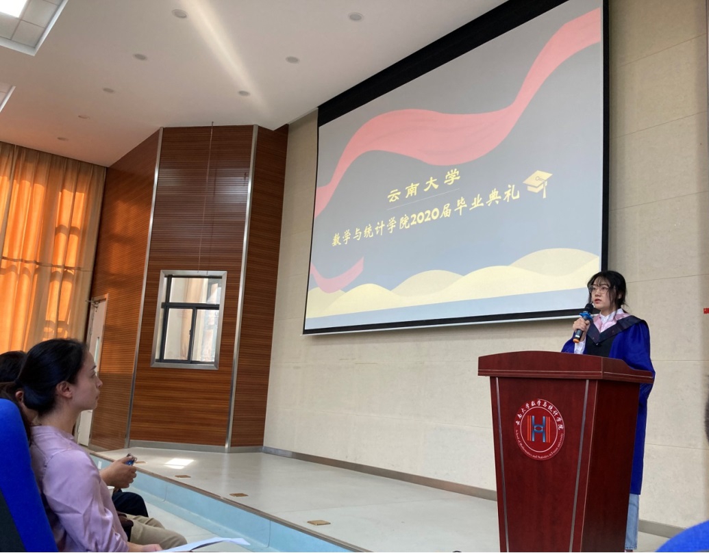 毕业生代表刘孟含和孙雪先后上台发言,她们回顾了自己在云大的岁月,表达了对时光稍纵即逝的惋惜,以及对同窗、老师和公司的感激与不舍。同时鼓励毕业生们人生没有终点,面对荆棘丛林勇往直前,面对鲜花掌声不卑不亢,并祝福每一位师生的未来都能更加灿烂美好。