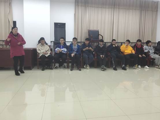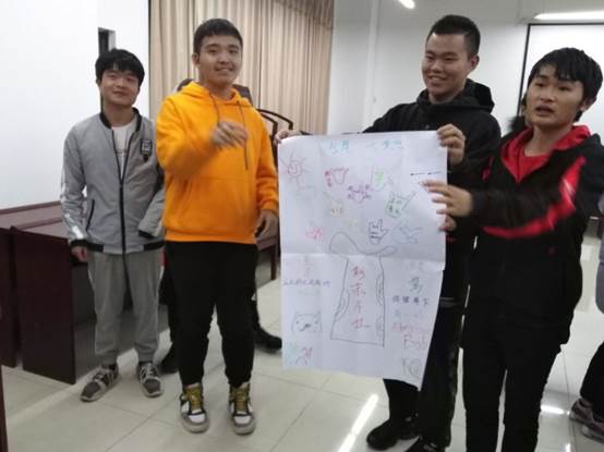 在游戏中,表现较差的一队将会受到小小的惩罚。第一个游戏是桃花朵朵开,没有抱团的员工带给同学们一段表演。第二个游戏是穿针引线,第三组的员工都是男生,不会穿线,所以不幸败北,他们带来了一段舞蹈,引得同学们哄堂大笑,第三个游戏是让小组画画,表现自己的愿望,每个小组势均力敌,不分上下。