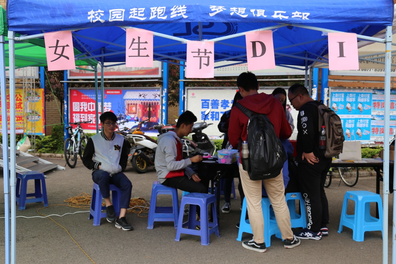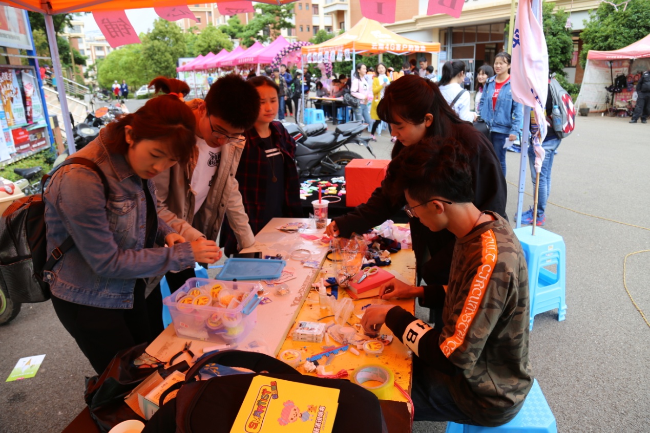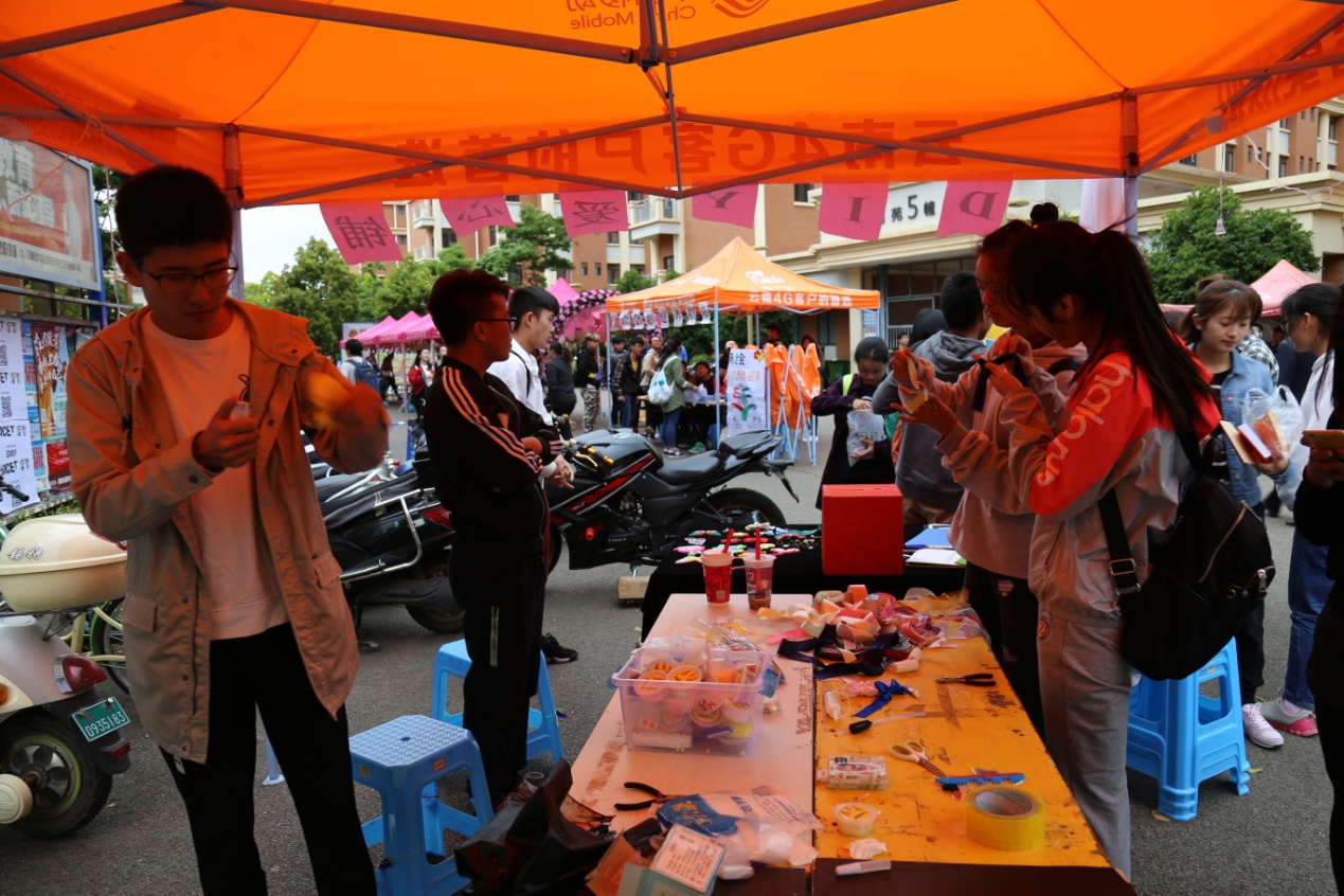 4月24日,在准备好帐篷等相关物资后,“DIY爱心铺”活动也正式开始。许多同学都被各个摊位上的时光宝石、指甲油花、滴胶、牛轧糖所吸引,所有工作人员在活动现场不停的忙碌着,参与的同学可以跟负责人学习如何制作。制作完成后,可以选择当场买走,也可以选择留下义卖。而白天没有卖完的工艺品可以放在“疯狂夜市”的手工摊位继续义卖,由于此活动可以让同学们亲自动手制作各种工艺品,因此参加此活动的人也非常多,大家都想看到自己努力的成果并通过自己的努力来做一份公益,奉献一份善心。