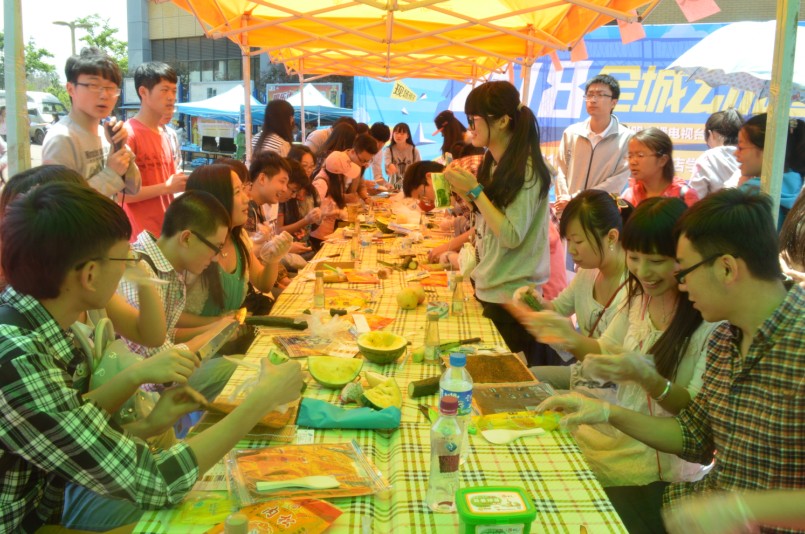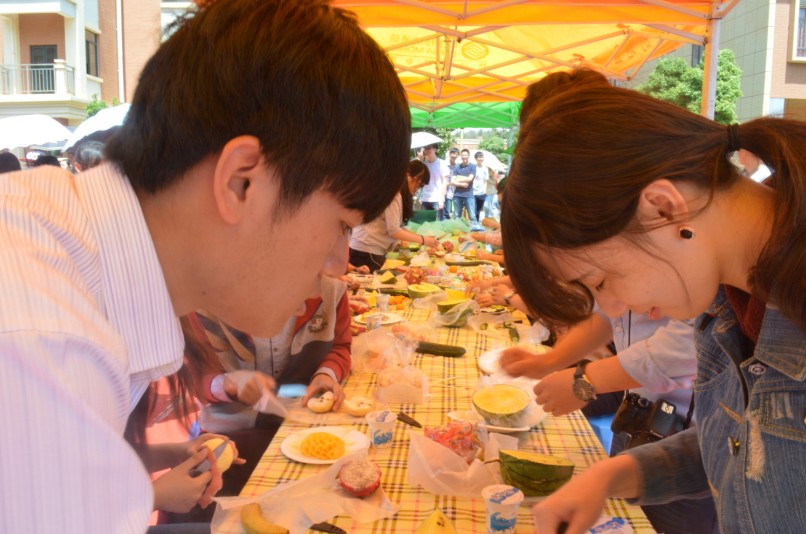 早上七点半,男生们就在楠苑食堂门口集合,开始给女生打电话叫她们起床并领取事先准备好的早餐去宿舍楼门口接女生。中午十二点时,活动准时开始。大家做出的水果拼盘和寿司形状各异,体现着个人不同的性格特点,但在送给众人品尝后大家均认为都十分美味,给予了一致好评。随着活动的进行,人气搭档投票活动也如火如荼的开展了!在活动场所附近的展板上贴出了各对搭档的照片,由路人来对其进行投票,同时,微信公共平台—云大小喇叭上也开展了网络投票环节,由两种投票方式的最终结果来推选出我们的人气搭档。