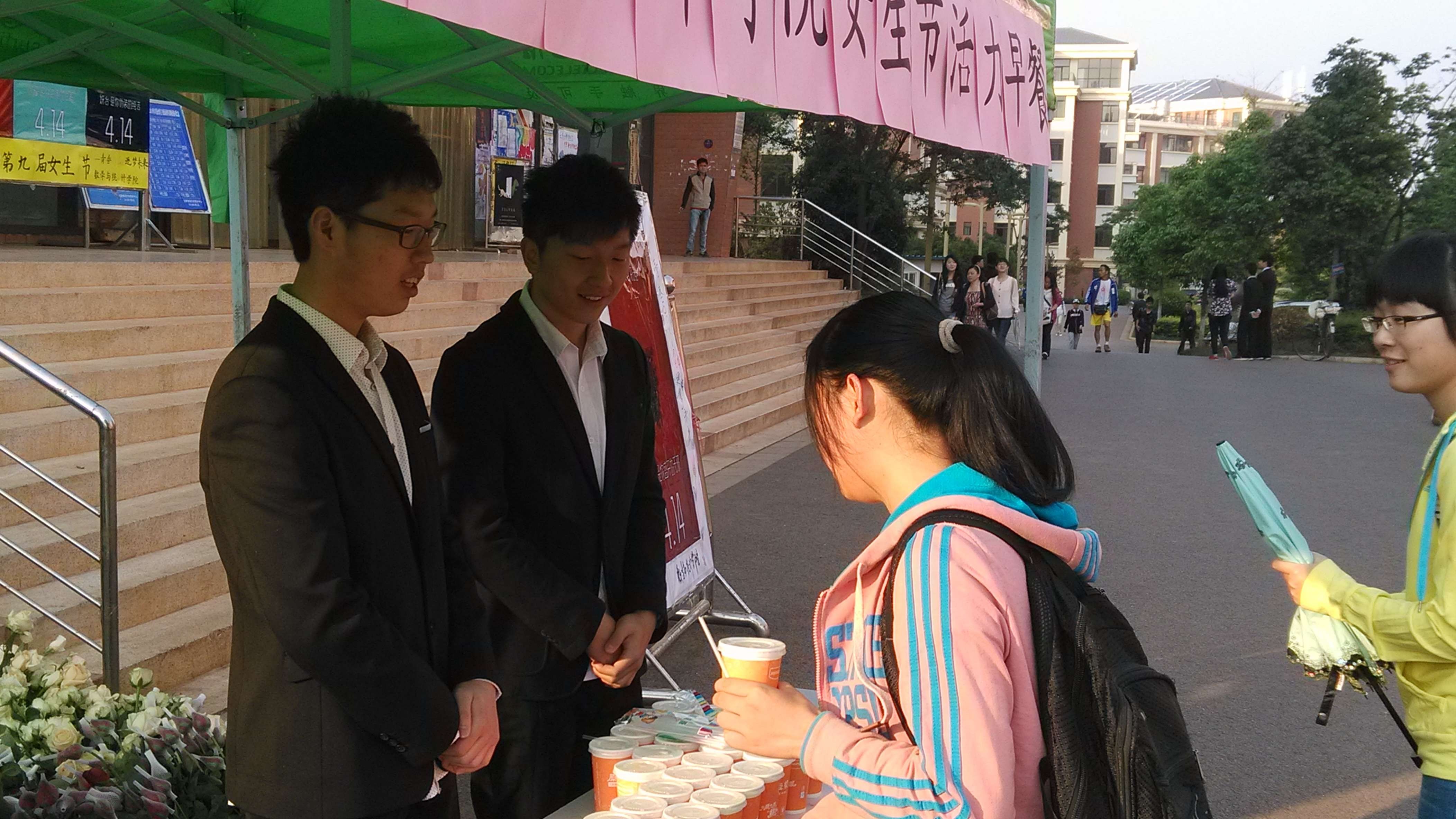 早上6点半,公司员工会和团委的男生们就齐聚在楠苑五栋宿舍楼下,准备为女生们服务。男生们穿着整齐精致的西装,买好早餐,准备好给今天的“幸运女神”们一个意外的惊喜。今天的“活力早餐”活动的幸运色是红色,所有身穿红色衣服的女孩们都能免费获得由数统公司为她们提供的活力早餐,并收到男生们热情的节日问候。在这寒意还未消散的早晨,面对“男人帮”送去的一份份早餐, “幸运女神”们的脸上充满了幸福的笑容。在这个微凉的清晨,男生和女生们为我们的校园增添了一份和谐。这次的活力早餐活动将从14日开始持续五天,到18号结束,每天都会选出一个幸运色为穿着这个颜色衣服的女生送上活力早餐,相信每个女生都能成为幸运女神,享受这样一份温暖。