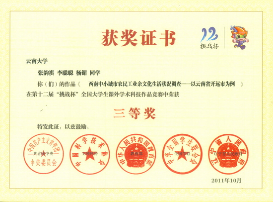 以云南省开远市为例》一文喜获全国第十二届挑战杯三等奖(张波指导)。