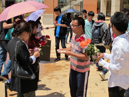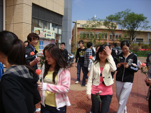 4月18日中午,呈贡校区各园区、格物楼前,williamhill官网网站的志愿者们把美丽的玫瑰和精致的贺卡送到了每个路过的女生手中,同时送出了节日的祝福。