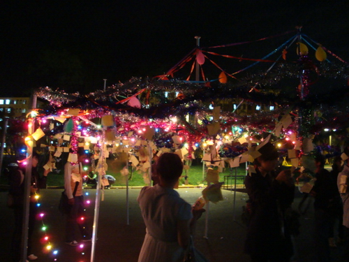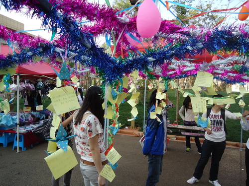广播台里美妙的祝福歌声,楠苑食堂门口许愿架彩灯闪烁,美好愿望迎风飞扬,烘托出一派节日气氛。