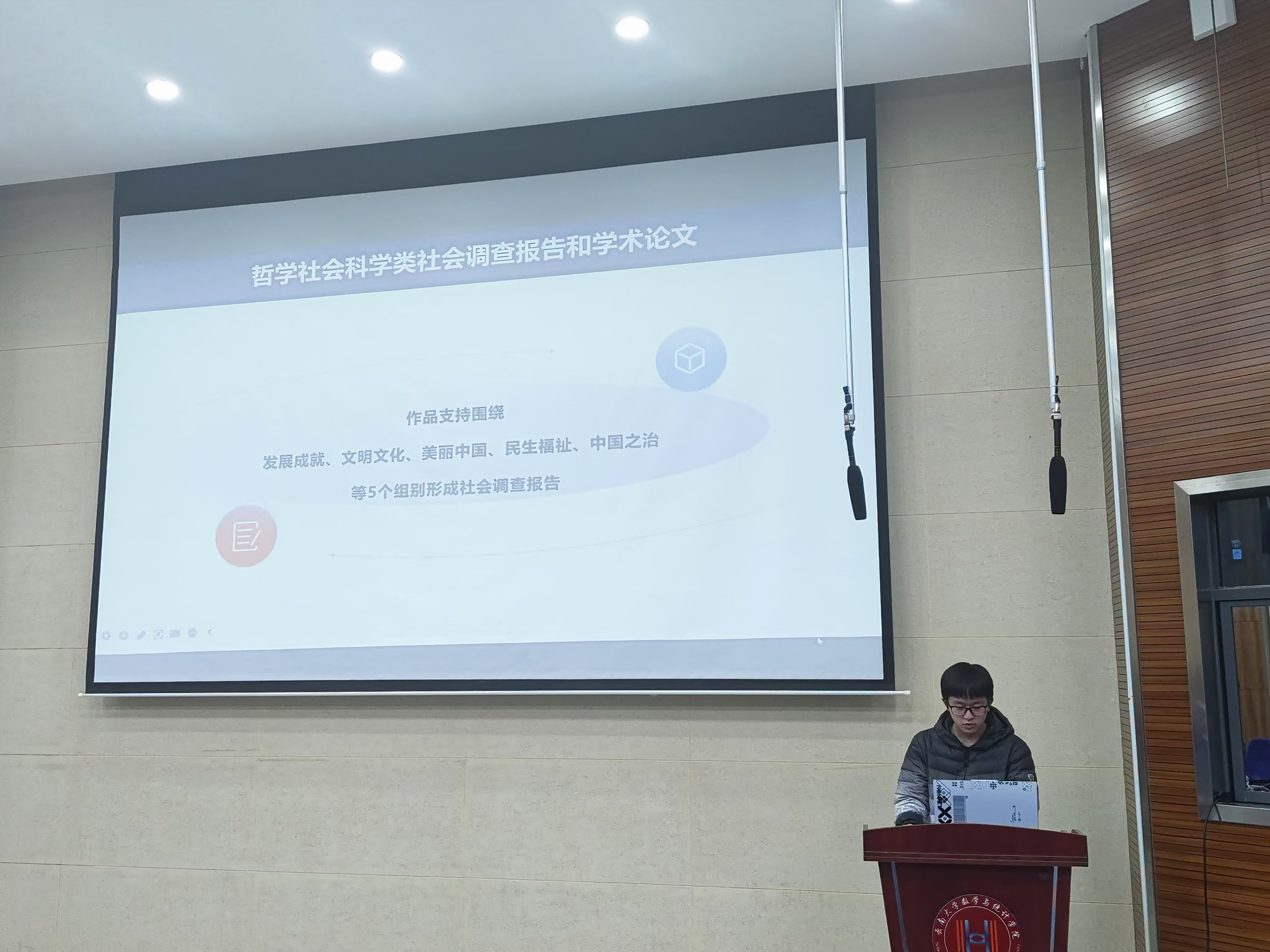 在选题指导环节,主讲人通过实际案例展示数学理论与现实应用的结合路径,为同学们开启了一扇全新的思路大门。他们引导同学们从社会热点、学科前沿、跨学科融合等多个维度寻找创新切入点。为了让同学们更好地把握优质项目的特征,主讲人对比分析了近三年获奖作品特征,总结出“问题导向明确、方法科技创新成果可验证”的优质项目共性。此时,台下的同学们纷纷陷入思考,有的同学小声与旁边的同伴交流自己受到的启发,有的同学则皱着眉头,似乎在脑海中快速筛选着可能的选题方向。