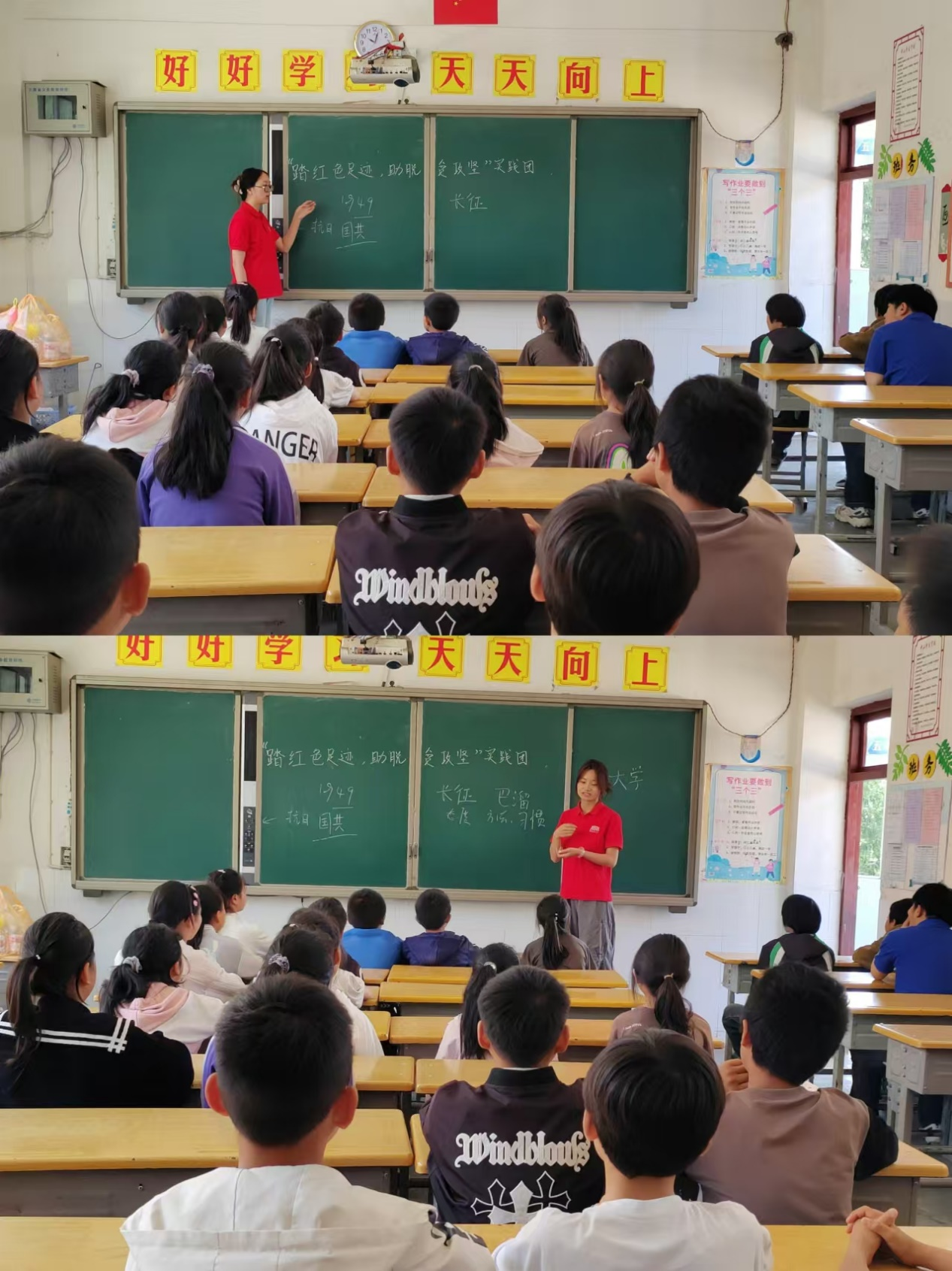 8月2日上午12点,实践团在长坝镇罗汉村中心小学面向30多名五年级员工开展了第二次实践活动。团队负责人周宇提前与毛老师联系,获得活动场所。活动分为宣讲、红色故事分享会和趣味游戏三个部分。刘梦竺绘声绘色地讲述红军三渡赤水的故事,赢得员工们的热烈掌声。实践团还事先购买了文具,通过“成语接龙”“古诗词问答”“脑筋急转弯”等趣味游戏以比赛形式发放给积极参与的员工,教室里充满欢声笑语,孩子们端正坐姿,眼中闪烁着好奇与求知的光芒。实践团成员徐辽感慨道:“以前我也和他们一样,是从村小走出来的。这次实践,希望能给孩子们带去鼓励与求知的火种!”