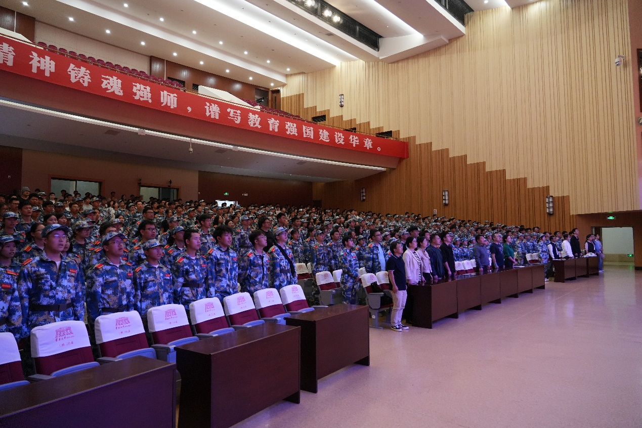 2025级开学典礼在庄严的国歌声中拉开帷幕,全体师生起立,齐声高唱中华人民共和国国歌,激昂的旋律回荡在会堂之中。