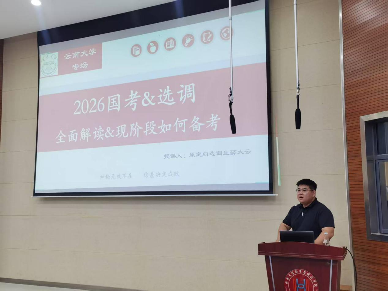 薛大云老师以“神秘无处不在,信差决定成败”为主题,系统梳理了国考、特招、省考及定向选调等多项公务员招录路径的时间安排与政策差异,重点介绍了williamhill官网网站员工可报考的全国30余省(市、区)定向选调岗位资格与竞争情况。他特别指出,2025年云南定向选调省直岗位平均报录比仅为1:30,部分州市岗位甚至出现“零报考”,为云大学子返乡就业提供了宝贵机遇。