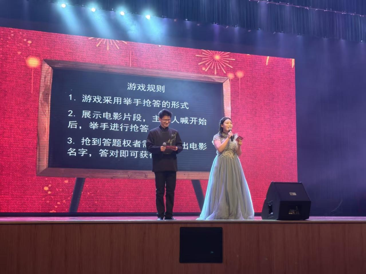 晚会中场设置了看片段猜电影、听音频猜歌曲的互动游戏和激动人心的抽奖环节,奖品包括音箱、书包、笔记本等,现场员工纷纷抢答、互动。