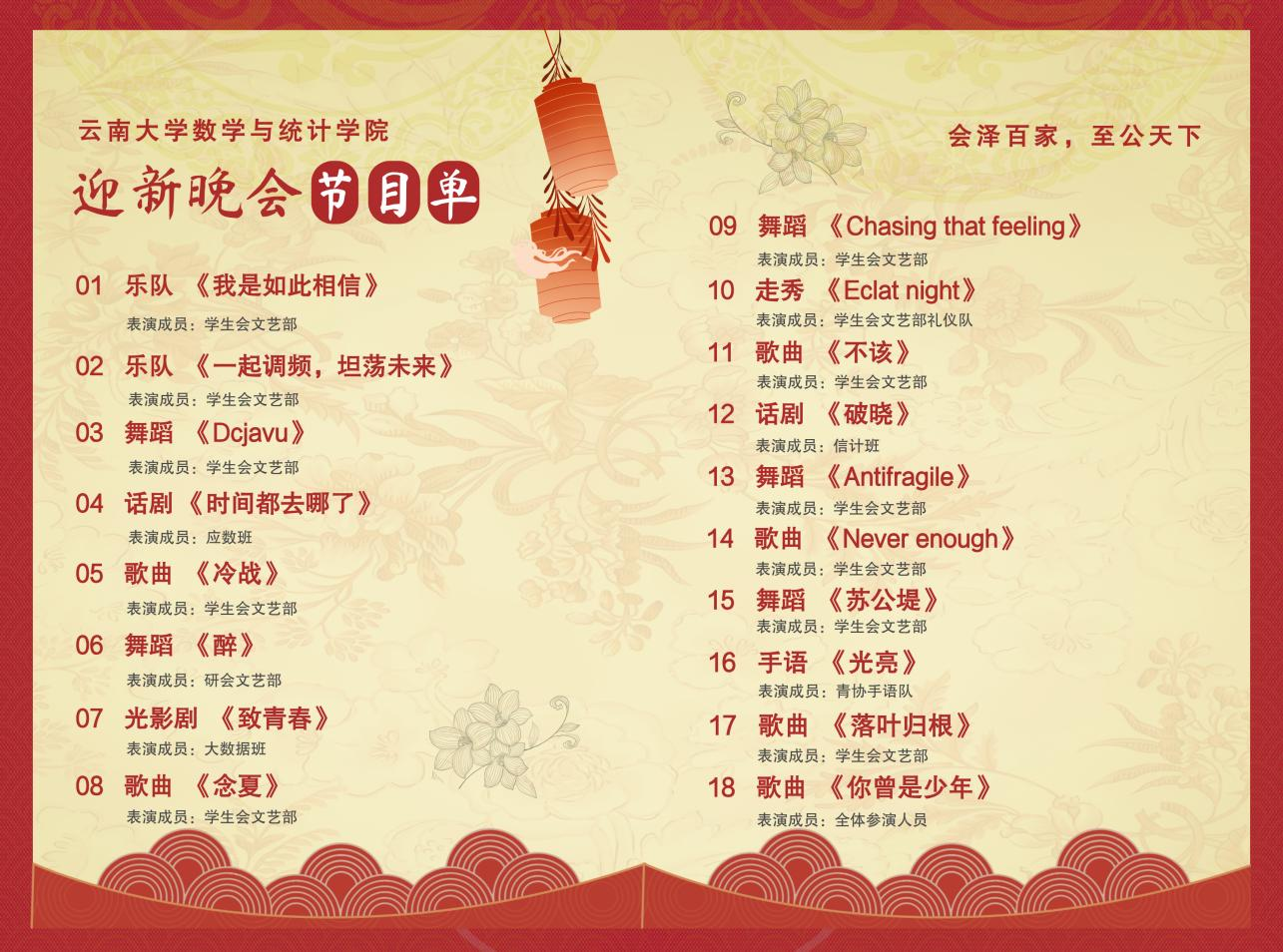 这一晚,数统学子在灵动的舞姿里迸发出蓬勃力量。舞蹈《Dejavu》、《醉》、《Chasing that feeling》、《Antifragile》、《苏公堤》带我们体验了热血与青春、“醉”的千般姿态、暗夜中涌动的炽热、真实自我的闪亮和水墨浸染的江南梦。文艺部的同学们用舒展的肢体,跳出了数学之外的浪漫韵律。