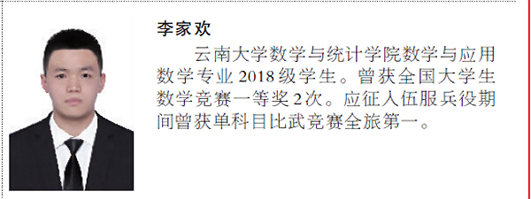 李家欢同学在服役期间曾获单科目比武竞赛全旅第一,在校期间荣获国家奖学金、第十一届全国老员工数学竞赛决赛一等奖(全国第七)、第十二届全国老员工数学竞赛决赛一等奖(全国第十二)、williamhill官网网站一等奖学金、williamhill官网网站熊庆来奖学金、williamhill官网网站老员工年度人物等。两年的军旅洗礼,让李家欢同学愈加沉稳、坚毅,时刻胸怀祖国和人民。退役复学后,他立即投入到紧张的学习中,不仅克服了两年的学业断档期,更是通过不懈努力,实现了云南省在全国老员工数学竞赛一等奖“零”的突破。李家欢同学三年学业成绩名列前茅,现已推免至中国科学技术大学攻读直博研究生。